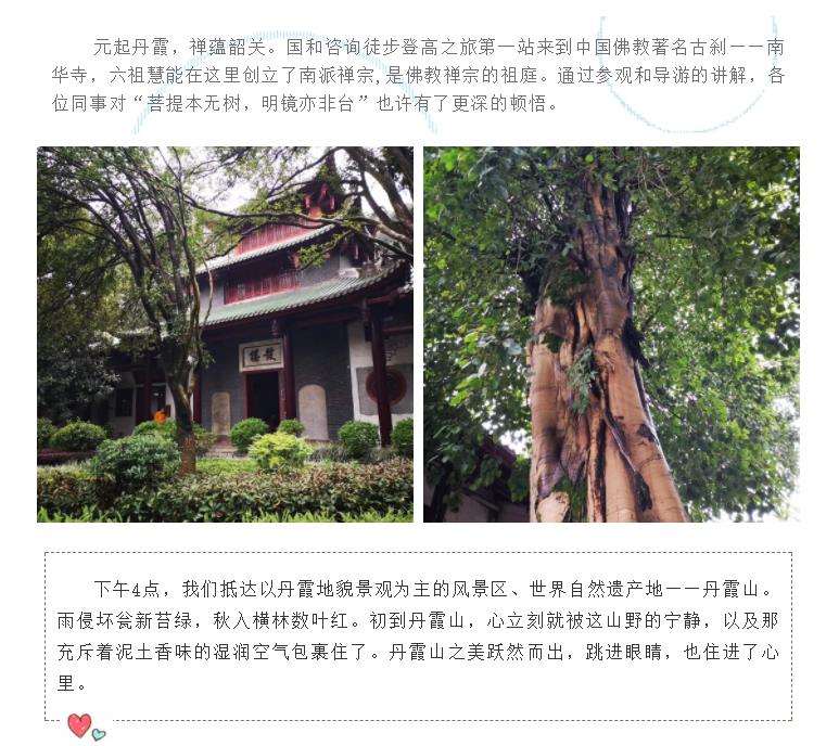 企業(yè)文化為了豐富員工的業(yè)余生活,緩解工作壓力,促進(jìn)員工之間的溝通與交流,提高團(tuán)隊(duì)協(xié)作和凝聚力,國(guó)和咨詢于11月17至18日組織開展了2018秋季丹霞山徒步登高旅游活動(dòng)。
